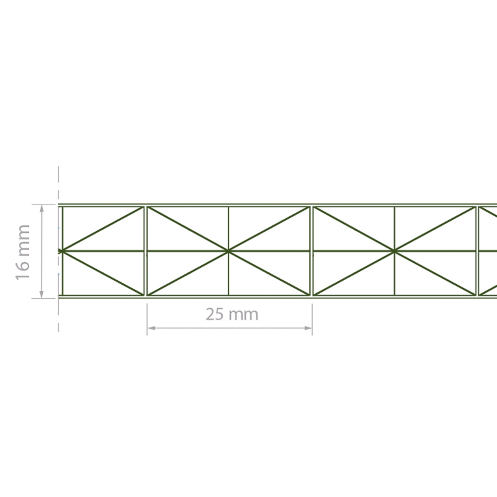 Bei dieser Polycarbonat Stegplatte handelt es sich um eine 5-fach-Stegplatte in 16 mm Stärke die trotz ihres leichten Gewichts eine hohe Steifigkeit aufweist. Die Stabiltität wird bei dieser Platte durch Ihre X-Struktur gewährleistet.