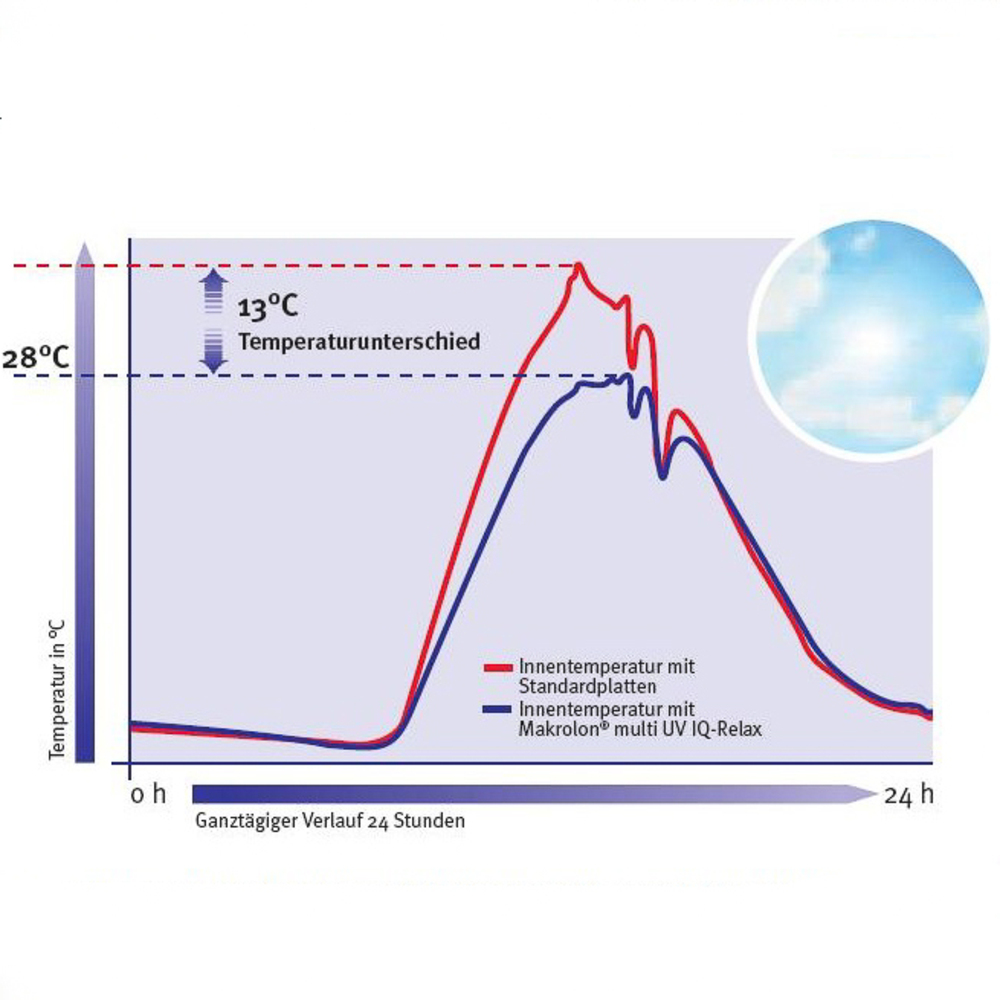 "Makrolon IQ Relax" Stegplatten besitzen eine hitzereflektierende Beschichtung um vor großer Wärmeeinwirkung zu schützen. Dadurch sorgt die neue Generation der "Makrolon IQ-Relax" Stegplatten stets für ein angenehmes und behagliches Raumklima und erschafft durch ihre homogene Lichtausbeute ein stets angenehmes „Lichtklima“.