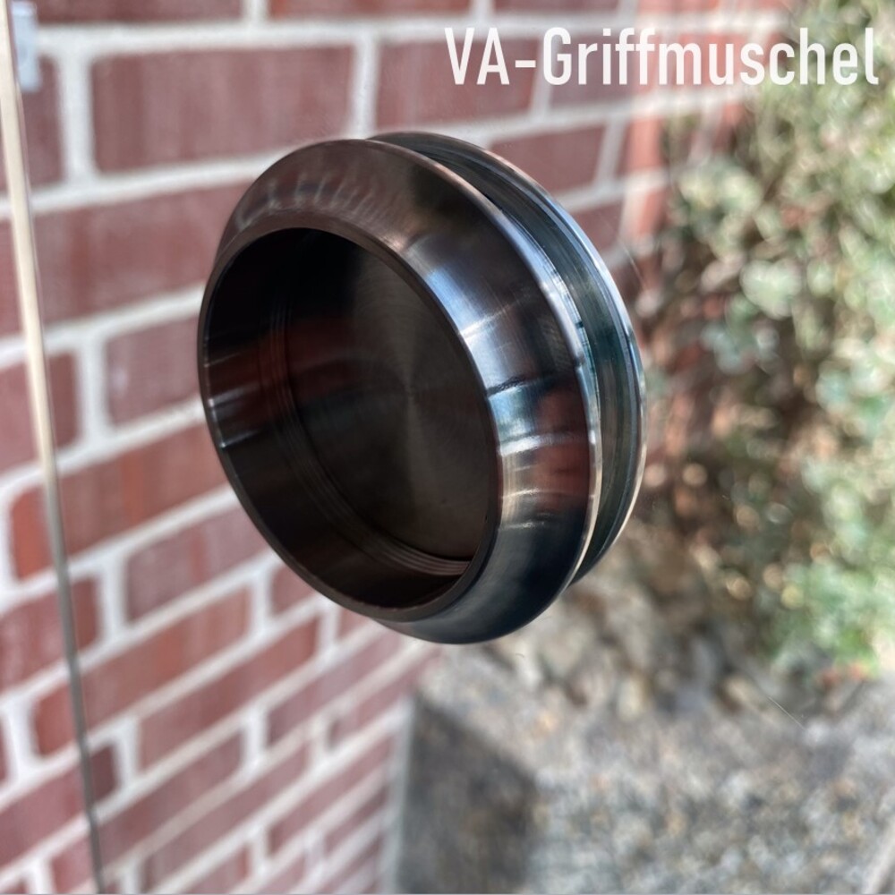 Zum einfacheren verschieben, können Sie die Glasscheiben zusätzlich mit Griffmuscheln versehen. Dazu werden die Scheiben mit einem polierten und geschliffen Handgriffloch (Ø 50 mm) und einer VA-Griffmuschel versehen.