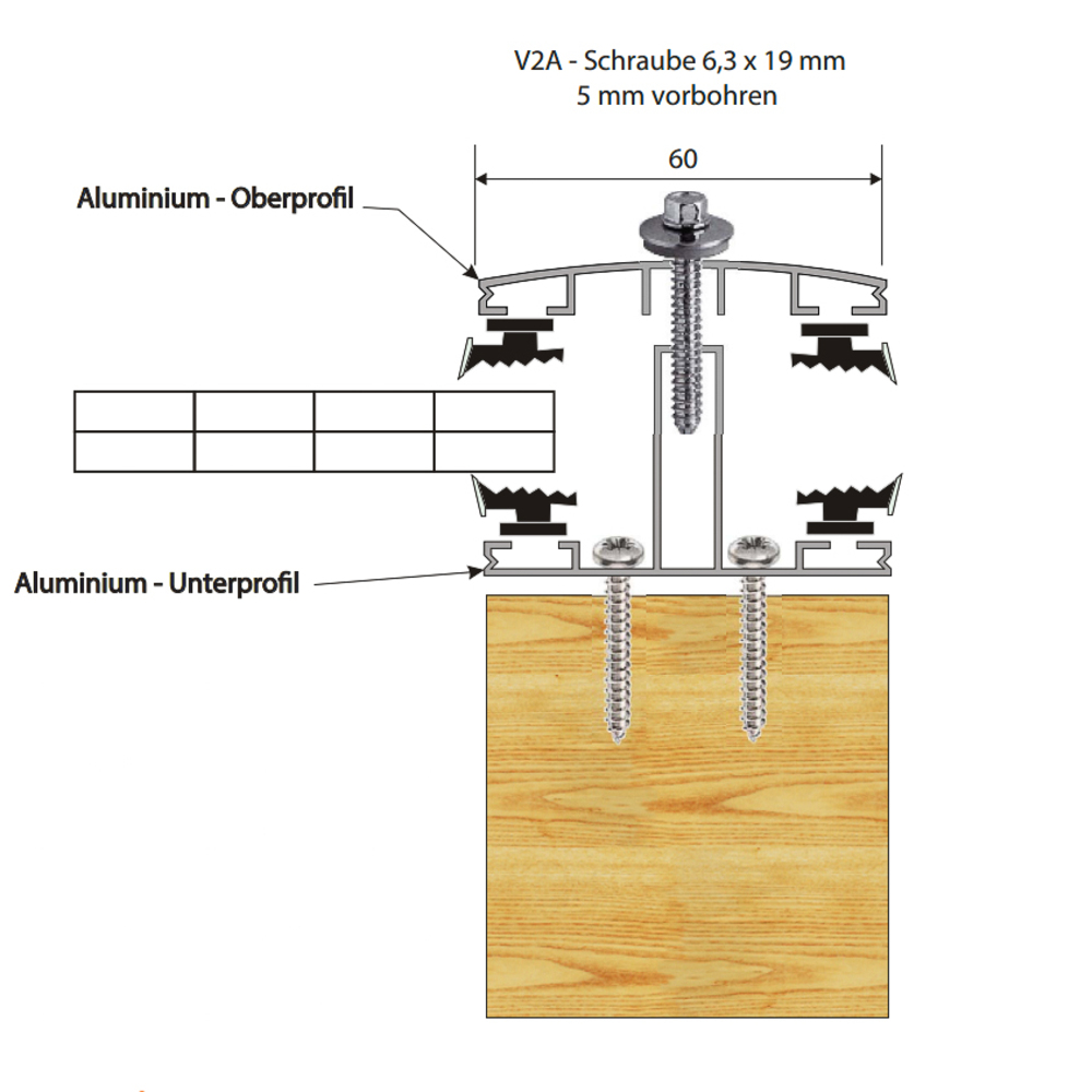 Zum Lieferumfang gehört die Mittelsprosse (bestehend aus Ober - und Unterteil), Lippendichtung, ausreichend VA-Schrauben (Bohrabstand etwa 30 cm) und VA-Schrauben zur Befestigung des Unterprofils wahlweise auf Metall oder Holz.