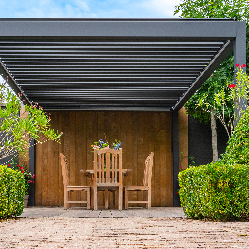 Da dieses Lamellendach freistehend ist, lässt es sich nahezu überall aufbauen. Ob als Grillplatz oder Sitzecke im Garten.