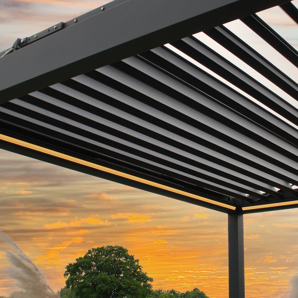 Mit diesem Lamellendach lässt sich der Lichteinfall ganz einfach über Knopfdruck regulieren, denn die Lamellen sind stufenlos bis zu 120° kippbar. Steuern lässt sich die Neigung bequem über eine Fernbedienung.