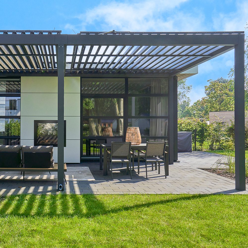 Spendet Schatten und bringt Licht zugleich, das Lammellendach Pinela.