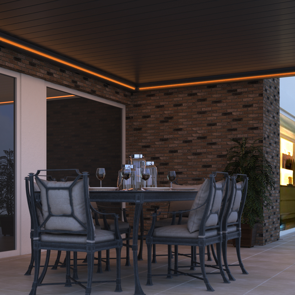 Die perfekte Ergänzung zu den Lamellendächern bieten unsere Glasschiebewände und drehbaren Zaunelemente. Somit lässt sich Ihr Außenbereich bei jedem Wetter optimal nutzen. Zudem lässt sich das Dach um einen LED-Lichtstreifen ergänzen.