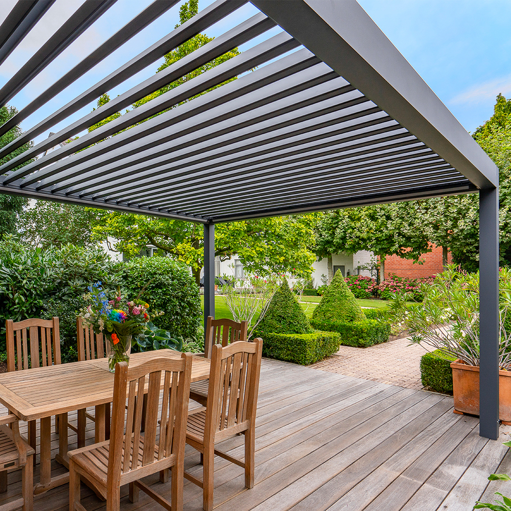 Spendet Schatten und bringt Licht zugleich, das Lammellendach Pinela.